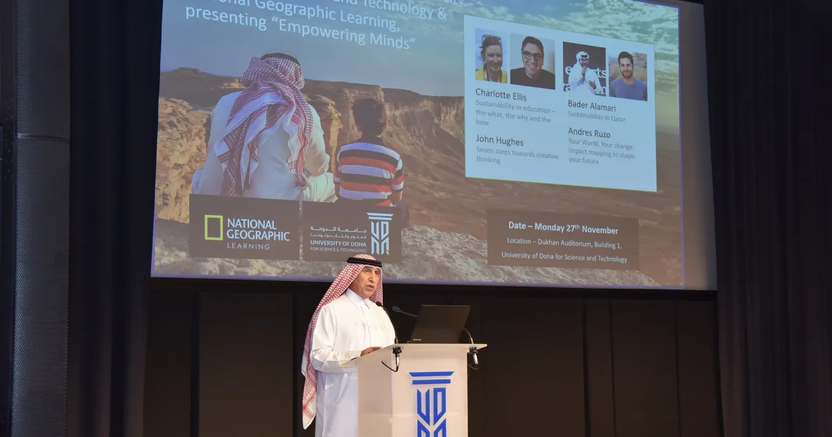 The event was attended by Dr. Salem Al-Naemi, President of UDST, who gave an enthusiastic welcome address, as well as guest speaker John Hughes, award-winning ELT author; Charlotte Ellis, Head of Strategic and Digital Marketing for National Geographic Learning; Andrés Ruzo, a geothermal scientist and educator; and Bader Alamari, a Youth Ambassador for the Sustainable Development Generation (SDGeneration) network and current UDST student.