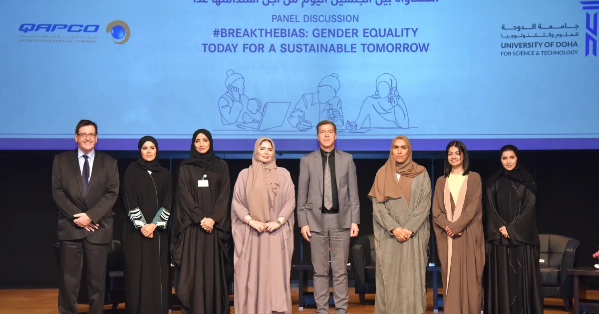 UDST organized a full day of activities to celebrate International Women’s Day. A panel discussion led by the University’s Applied Research and Innovation and supported by QAPCO entitled “#BreakTheBias: Gender equality today for a sustainable tomorrow” took place in the presence of prominent women from the Qatari community: Ms. Fatima Al Saadi, Capability Building Manager at Qatar Petrochemical Company (QAPCO); Nada Mir, national team golf player and UDST student; Amal Dahawi Al-Shamari, Strategic Planning Manager for Qatar Fertiliser Company (QAFCO); Fathea Salama, Director of Pharmacy at Sidra medicine. The discussion was moderated by Wadha Salem Alathba, a communication expert and an influential life coach.